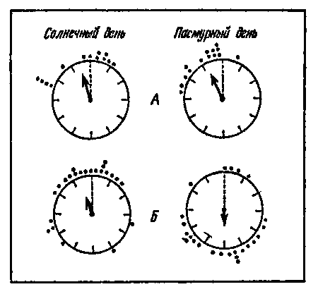 Исследователи установили, что в солнечную погоду направление магнитного поля не влияло на способность голубей ориентироваться. Но в условиях сплошной облачности изменение направления магнитного поля приводило к смене направления полета птиц на противоположное (рис. 32). Было сделано предположение, что магнитное поле играет определенную роль в навигации птиц. В дальнейшем было показано, что голуби обладают высокой магнитной чувствительностью. В опытах, длившихся три года, У. Китон с коллегами обнаружили, что отклонения земного магнитного поля от нормы менее чем на 10-3 Гс., вызванные солнечными вспышками и пятнами, по-видимому, оказывают достоверное влияние на выбор направления голубями при старте. Недавно П. Сэмм и К. Демаин сообщили, что магниточувствительные нейроны, реагирующие на изменение магнитного поля, были обнаружены у голубей в базальном зрительном тракте. До этого «магнетит» находили только в области между носовыми полостями и глазницами, в оболочках вокруг обонятельного нерва.