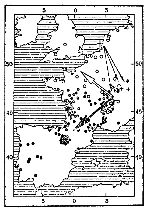 Позже А. Пердек в конце 50-х годов перевез около 15 тыс. скворцов во время осенней миграции из Голландии в Швейцарию и Испанию. В первом эксперименте он выпустил в трех местах Швейцарии (в 750 км. к юго-востоку от места поимки) 11 тыс. скворцов. В тот же год было получено 354 возврата, 131 из них с расстояний более 50 км. от места выпуска. Эти находки смещенных скворцов показали, что молодые птицы, которые впервые совершали миграцию, продолжали лететь после выпуска в стандартном для европейских популяций этого вида направлении — на запад и юго-запад (рис. 33). В результате они зазимовали в необычном для них районе (в Южной Франции и Испании). Возвраты в последующие годы показали, что птицы возвращались в эти районы и в дальнейшем. Взрослые птицы показали после выпуска двойное распределение: одна группа продолжала лететь как и молодые птицы, но другая дала возвраты из характерных для них районов зимовки (Англии и северной Франции). Третья группа (19 особей) дала возвраты из северных районов, с традиционной трассы миграции скворцов. В следующем эксперименте 3600 скворцов, отловленных осенью в Голландии, перевезли в Барселону (Испанию). Вновь молодые птицы продолжали мигрировать в компасном юго-западном направлении, а взрослые сместились в сторону зимовки.
