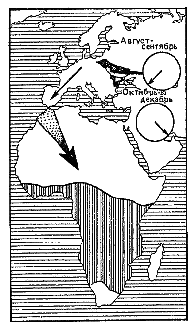 Рис. 33. Результаты эксперимента по завозу молодых и взрослых обыкновенных скворцов с трассы осенней миграции из Голландии в Швейцарию.