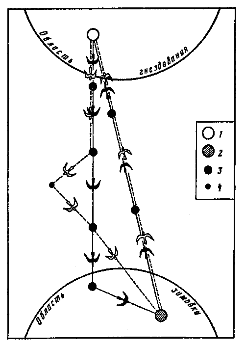 1 — район гнездования (цель весенней миграции), 2 — район зимовки (цель осенней миграции), 3 — основные места остановок птиц во время миграции (промежуточные цели осенней и весенней миграций), 4 — случайное место остановки при миграции (целью миграции не является).