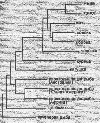 У истоков четвероногих. По характерным признакам митохондриальной ДНК можно вычислять степень родства разных, даже далеко разошедшихся на тропинках эволюции видов животных. Вот эта-то ДНК и преподнесла сюрприз: оказалось, что митохондриальная ДНК лягушки все-таки значительно ближе к ДНК двоякодышащих рыб, чем к ДНК целаканта. Возможно, окончательной разгадки мы так и не дождемся — тайну происхождения четвероногих унесла с собой вымершая рипидистия, пресноводный вариант целаканта.