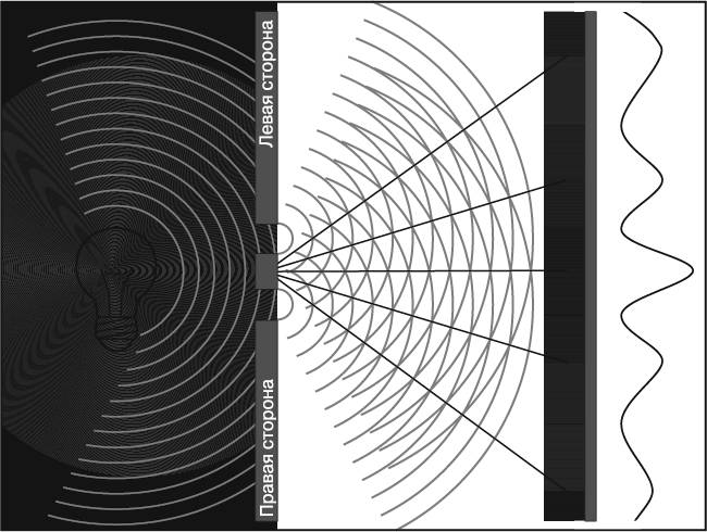 Рис. 4.1. Опыт с двумя щелями, стадия 1. Когда монохромный свет (имеющий определенную длину волны) направляется на две щели, каждая щель выступает в качестве нового источника света с другой стороны. Благодаря волновой природе свет распространяется (рассеивается) после прохождения через каждую щель, так что круговые волны перекрываются и взаимодействуют друг с другом, образуя темные и светлые полосы на заднем экране