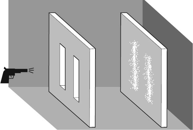 Если бы вас попросили предсказать распределение ярких точек и вы бы ничего не знали о квантовой механике, вы бы, естественно, догадались, что оно напоминало бы картину, полученную в опыте с пулями. А именно: позади каждой щели образуется полоса точек, то есть на экране возникают два различных светящихся участка, более ярких в центре и постепенно угасающих к краям, поскольку попадания атомов становятся более редкими. Также можно ожидать, что участок посередине между двумя яркими полосами будет темным, так как он соответствует части экрана, непроницаемой для атомов, в какую бы щель они ни попали.