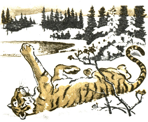 …Случилось это в Приморье в снежном и морозном декабре. Встретились два тигра. Оба взрослые, оба самцы, оба могучие. Но один из них был на своем охотничьем участке, а другой — бродяга — вторгся в чужие владения. Дрались долго и остервенело. Ревели — за три километра слышно было. Все живое в страхе притихло, как перед грозой. В конце концов бродяга сдался и ушел. А через несколько дней охотоведы нашли его мертвым. Вывезли в город, вскрыли, обследовали. И — странное дело! Шкура тигра была целой! Только большие кровоподтеки свидетельствовали о том, что зверь яростно дрался с другим тигром. Но оказывается, дрался своеобразным способом — тумаками, не пуская в ход зубы и когти. Погиб побежденный, правда, по другой причине: он был серьезно болен, и вскоре умер бы и так.