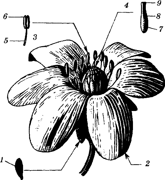 Строение цветка: 1 — чашелистик: 2 — лепесток; 3 — тычинка; 4 — пестики; 5 — тычиночная нить; 6 — пыльники; 7 — завязь; 8 — столбик; 9 — рыльце