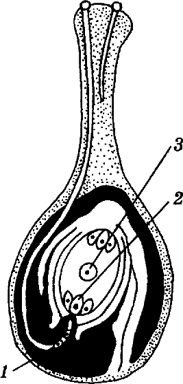 Оплодотворение у растений: 1 — спермии; 2 — яйцеклетка; 3 — центральнаяклетка