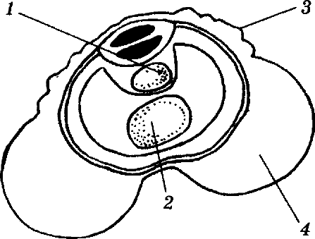 Пыльцевое зерно сосны: 1 — генеративная клетка, образующая спермии; 2 — клетка пыльцевой трубки; 3 — оболочка; 4 — воздушные мешки