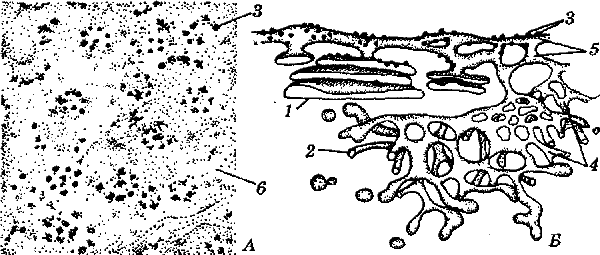 Эндоплазматическая сеть (ЭПС):А — перерисовка электронной микрофотографии; Б — реконструированная схема; 1 — мембрана; 2 — трубочки; 3 — рибосомы; 4 — гладкая ЭПС; 5 — шероховатая ЭПС; 6 — цитоплазма