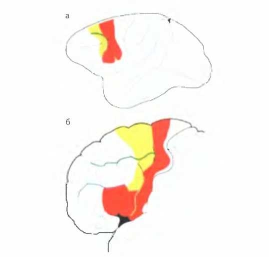 Зеркальные нейроны были впервые открыты в премотор-ной коре обезьян (а). У людей они, по-видимому, занимают также области лобной доли, связанные с намерениями и эмоциями (б).