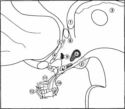 1 fornix; 2 corpora mamillaria; 3 thalamus; 4 nucleus suprachiasmaticus; 5 преоптическая область; 6 nucleus tuberomamillaris;;7 nucleus infundibularis (arcuatus); 8 nucleus paraventricularis; 9 nucleus supraopticus; 10 neurohyphysis; 11 adenohypophysis; 12 система воротной вены
