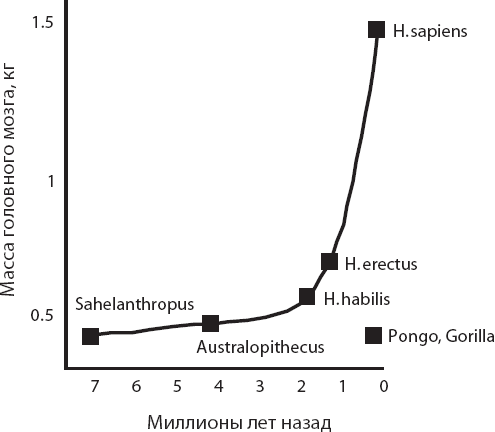 Рис. 11.1. Быстрое увеличение массы мозга в линии рода Homo в течение последних полутора миллионов лет; однако такого роста не наблюдают в линиях, приведших к появлению современных крупных человекообразных обезьян