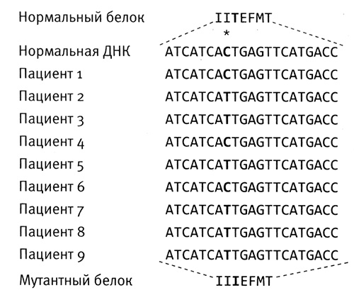 Рис. 7.5. Повторное возникновение мутации, обеспечивающей устойчивость к противораковому препарату. Изображен короткий фрагмент белковой последовательности (верхняя строка) и соответствующий фрагмент ДНК (вторая строка), связанные с развитием хронического миелолейкоза (ХМЛ). У шести пациентов с ХМЛ (пациенты 2, 3, 5, 7, 8 и 9) в одном и том же положении возникла мутация (звездочка), заключающаяся в замене основания C на T, в результате которой опухолевые клетки стали нечувствительными к лекарству, связывающемуся с данным белком. Рисунок выполнен Лианн Олдс на основании данных из статьи Gorre et al. (2001), Science 293:876.