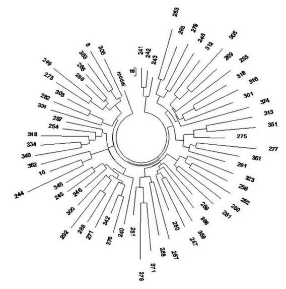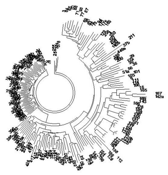 В сети есть Проект Индии (FTDNA), это фактически база данных индийских гаплотипов. В ней 187 гаплотипов в 37-маркерном формате, из них 64 гаплотипа гаплогруппы R1a, то есть 34 % от всех. Дерево всех 187 гаплотипов выглядит следующим образом (построено с помощью профессиональной компьютерной программы PHYLIP 3.695 с преобразованием в программе MEGA6).