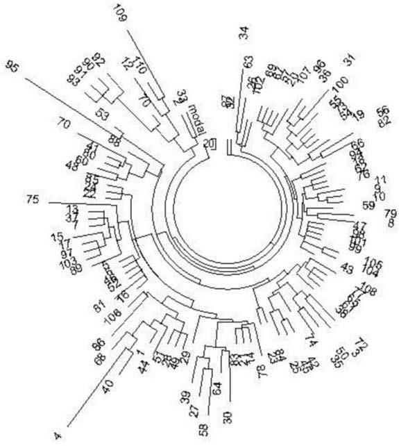Рис. 70. Дерево из 110 гаплотипов (в 10-маркерном формате) гаплогруппы R1a в индийских кастах и племенах. Построено по данным Sengupta et al[255]. Формат гаплотипов – DYS 393, 390, 19, 391, 388, 439, 389-1, 392, 389-2, 461 (константа скорости мутации 0.0149 мутаций на гаплотип на условное поколение в 25 лет).