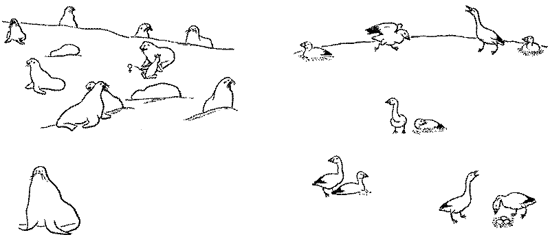 Рис. 21. Совмещенные на одном рисунке участки гнездовой колонии белых гусей (рисунок Е. В. Сыроечковского) и берегового лежбища морских котов. Позволяют сопоставить их пространственную структуру, схожую и несхожую одновременно
