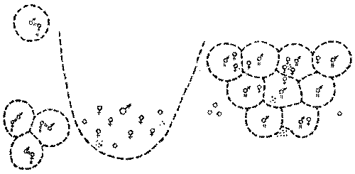 Во-первых, встает вопрос о природе сил, распределяющих особи в пространстве, стягивая их в скопления и разгоняя в стороны. И рассеивание, и скучивание не совсем хаотичны. Рассеивание вызывается как ослаблением привязанности особи к месту своего рождения (это ослабление географических привязок может быть и однократным, и многократно повторяющимся на протяжении жизни), так и избеганием контактов с другими особями своего вида, т. е. следствием некоторого взаимного отталкивания. Скучивание же зависит как от стремления многих особей занять одну географическую точку независимо от наличия пли отсутствия там соплеменников (например, стремление вернуться в точку рождения), так и от влечения особей к соплеменникам, что ведет не только к встречам половых партнеров, но и к сбиванию в кучу однополых зверей на лежбище или членов одной стаи рыб или саранчи. Это влечение гонит к соплеменникам независимо от локализации и перемещений последних.