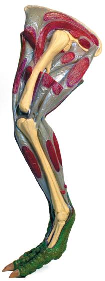 Мускулатура задних конечностей нептичьих динозавров и птиц похожа. Крупный гребень на большеберцовой кости – в особенности большой торчащий гребень на ее передней поверхности – показывает, что там крепилась массивная выпуклая мышца. Аналогичная мощная мышца крепилась и к задней поверхности. А вот голень практически у всех мезозойских динозавров была тонкой, как и у нынешних птиц.