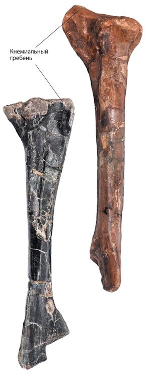 На большеберцовой кости практически у всех динозавров был треугольный вырост – кнемиальный гребень. К нему крепилась большая выпуклая мышца, покрывавшая переднюю поверхность голени. Кость слева принадлежит орнитоподу мантеллизавру, справа – тероподу мегалозавру