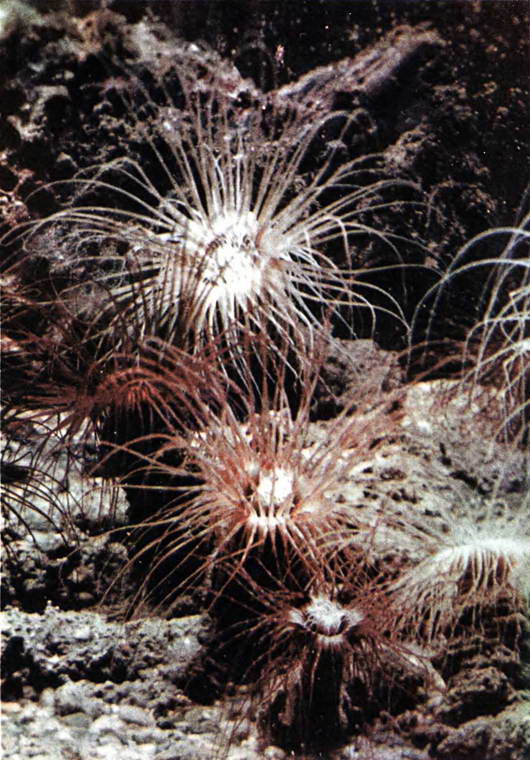 Названия многих из них говорят скорее о принадлежности зарослей к растительному царству: морские лилии, мшанки, морские анемоны. И все же это не растения. Больше всего здесь колониальных организмов — губок, гидроидов, роговых кораллов, морских перьев, мшанок; но есть и одиночные: актинии, морские лилии, погонофоры. С представителями некоторых групп этих прикрепленных животных мы уже встречались на литорали; однако там они имели второстепенное и третьестепенное значение, а в более глубоких участках моря им принадлежит одна из ведущих ролей.
