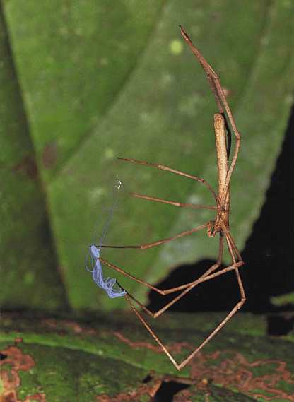 Этот паук Dinlopis spinosa держит свою паутину на кончиках ног. Когда мимо будет пролетать какое-нибудь насекомое, паук быстро набросит на него сетку и заарканит.