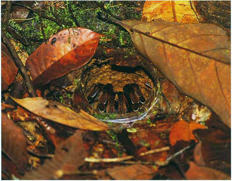 Паук-мигаломорф ждет жертву у входа в свою нору, отмеченного паутинными нитями. Основу меню этого паука обычно составляют крупные насекомые.