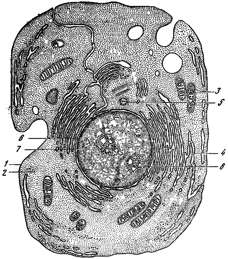 1 — оболочка клетки, 2 — цитоплазма, 3 —митохондрии, 4 — эндоплазматическая сеть, 5 — центросома, 6 — оболочка ядра, 7 — ядро, 8 — ядрышко