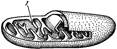Рис. 28. Интенсивный синтез АТФ происходит в митохондриях — органоидах клетки, похожих на наполненный жидкостью сосуд с заходящими внутрь стенками. Стенка митохондрии состоит из двойной мембраны: складки внутренней мембраны заходят внутрь сосуда, образуя кристы (1)