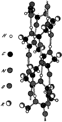 Рис. 31. Схема строения ДНК из двух спирально закрученных полинуклеотидов (по Уотсону и Крику)
