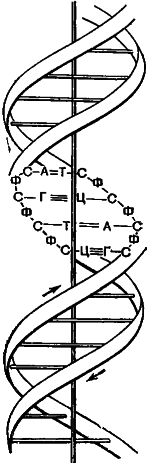Спирально закрученные ленты — скелет молекулы, состоящей из остатков фосфорной кислоты (Ф) и сахара дезоксирибозы (С); перекладины между лентами — пары азотистых оснований, связанных водородными связями; A, T, Г, Ц — азотистые основания. Вертикальный стержень — ось симметрии