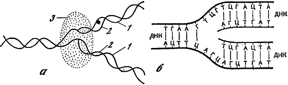 а — синтез дочерних нитей ДНК (2) на основе материнских нитей (1) при посредстве фермента ДНК — полимеразы (3); б — образование комплементарных нитей ДНК путем присоединения нуклеотидов, дополнительных к паре нуклеотидов (репликация)
