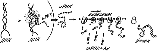 Аминокислоты в клетке связаны с полинуклеотидными цепочками тРНК таким образом, что каждой аминокислоте соответствует своя цепочка тРНК. Следовательно, в клетке имеется, по крайней мере, 20 различных типов тРНК. Присоединение аминокислот к полинуклеотидной цепочке тРНК осуществляется в несколько этапов. Сначала аминокислота активизируется путем реакции с АТФ и ферментом. В итоге образуется комплекс АМФ — аминокислота и отцепляющаяся от АТФ пирофосфорная кислота. Затем активизированная аминокислота под влиянием фермента присоединяется к тРНК. Цепочка из аминокислоты и тРНК направляется к рибосоме, «узнает» соответствующий ей триплет азотистых оснований в нити тРНК и присоединяется к нему. Таким путем аминокислота оказывается на должном месте. Затем аминокислоты объединяются в полипептидную нить. Происходит перевод (трансляция) информации с языка, записанного при помощи чередований азотистых оснований в иРНК, на язык аминокислотной последовательности (рис. 34). Таким образом, ДНК определяет специфичность РНК, которая в свою очередь придает специфичность белковым синтезам[51].