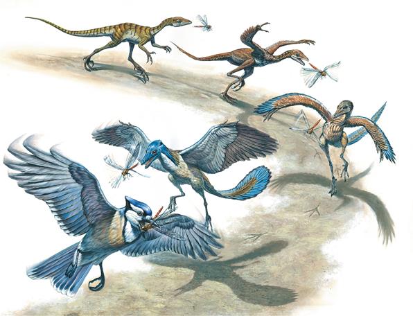 Классическая иллюстрация 1980-х гг. демонстрирует гипотезу Джона Острома о том, что наземные тероподы каким-то образом развили перья и способность летать и в конечном итоге породили птиц. Сейчас уже мы не считаем, что птицы появились именно так