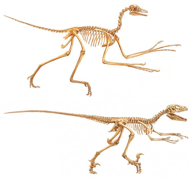 Сегодня мы знаем, что скелеты ранних представителей родословной птиц – например, археоптерикса (наверху) – очень похожи на скелеты птицеподобных манирапторов вроде дейнониха (внизу). Археоптерикс – по сути, это мелкий облегченный дейноних