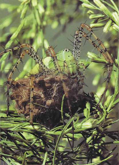 Зеленая окраска хорошо маскирует паука-рысь, когда он охраняет свой яйцевый кокон, сидя среди растений.