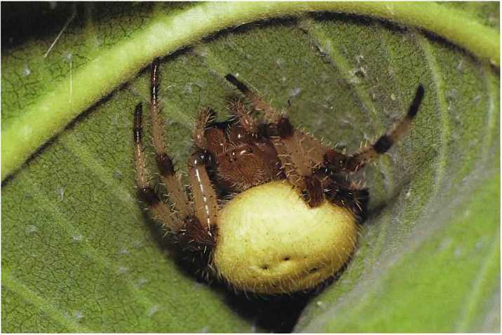 Самка паука-кругопряда (Epeira raji) закуталась в зеленый листик и притаилась в середине своего гнезда.