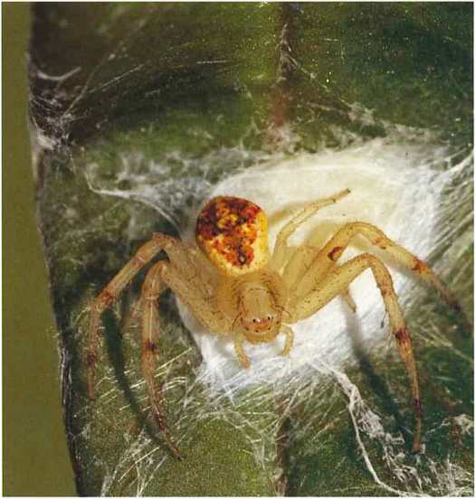 Тесно прижавшись к своему яйцевому кокону, самка паука — краба охраняет его от опасности. Самки пауков всегда героически защищают своих отпрысков, если им угрожает какая-нибудь опасность.