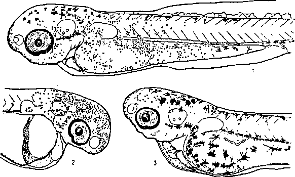 Так как скорлупа и подстилающие ее оболочки у птиц, оболочка икринок у рыб, хитиновые оболочки яиц насекомых и пр. — являются дериватами материнского организма, то при гибридизации, как и в случае беременности, могут возникнуть несоответствия между свойствами оболочки и свойствами эмбриона. Интересный пример подобного явления изучен Крыжановским (неопубликованные данные). Для вылупления из оболочки икринки мальки например леща (Abramis brama) и карася (Carassius carassius) растворяют ее при помощи мелких многочисленных железок (рис. 54), расположенных на голове и выделяющих специфический секрет. У леща (фиг. 2) эти железки развиваются уже на 2-й день эмбрионального развития, у карася (фиг. 1) — на 5-й день, когда и происходит соответственно вылупление. При оплодотворении яиц леща спермой карася вылупление происходит, как и у отцовского вида, на 5-й день. Исследование показало, что и железки гибрида развиваются тоже лишь на 5-й день.