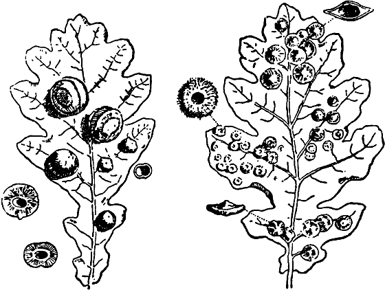 На листьях дуба в конце лета часто встречаются красивые орешки-галлы. Зеленые вначале, они потом краснеют и выглядят как маленькие яблочки, прилипшие к листу. Кто из нас не собирал их в детстве!