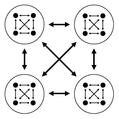 Если у какого-то вида животных кооперация уже развилась настолько, что вид перешел к общественному образу жизни, то дальше начинаются интересные вещи. Во многих случаях оказывается, что индивид может успешно размножиться только будучи членом успешной группы. При этом конкуренция обычно существует не только между особями внутри группы, но и между группами. К чему это приводит, показывает модель вложенного перетягивания каната, которую разработали американские этологи. Reeve Н. К., Holldobler В. The emergence of a superorganism through intergroup competition // PNAS, 2007.