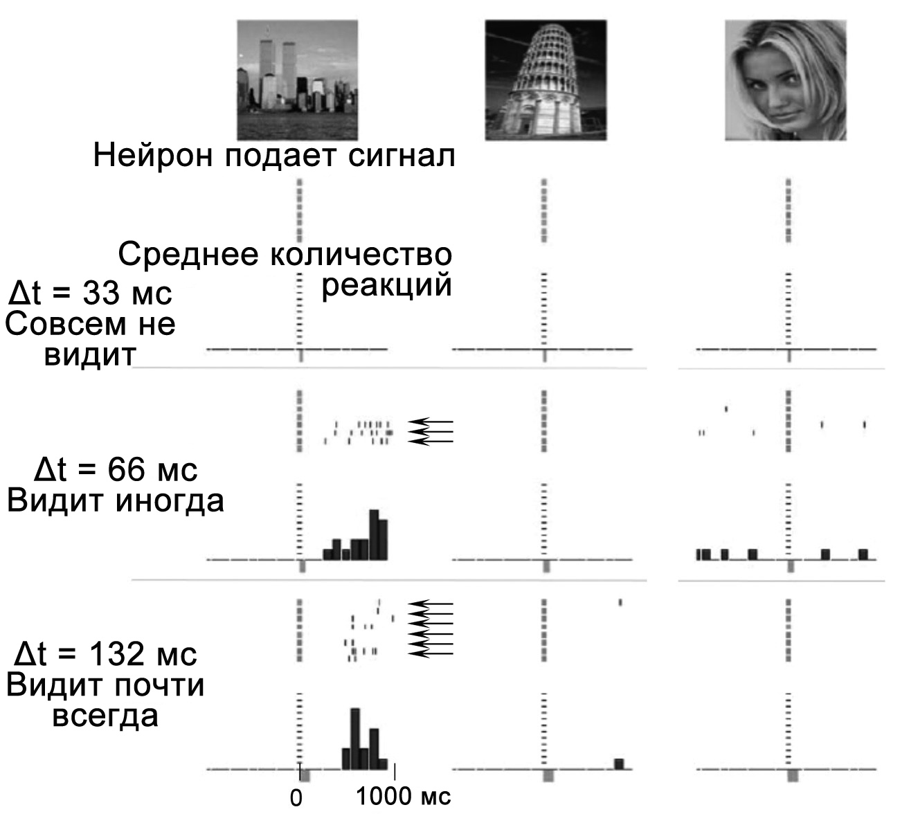 Рисунок 22. За сознательное восприятие образов отвечают отдельные нейроны, которые подают сигнал, только когда мы осознанно воспринимаем определенное изображение. В этом примере нейрон передней височной доли демонстрирует избирательную реакцию на изображение Всемирного торгового центра, однако практически исключительно в случае, если изображение было увидено осознанно. При увеличении времени показа сознательное восприятие происходит чаще. Нейрон подает сигнал только в случае, когда человек может сообщить, что видел картину (эти случаи помечены стрелкой). Нейрон действует избирательно и редко реагирует на иные образы, например на человеческое лицо или на пизанскую башню. Поздняя устойчивая его активация указывает на совершенно определенный образ, воспринимаемый сознательно. Взятые вместе, миллионы нейронов такого рода кодируют все, что мы видим