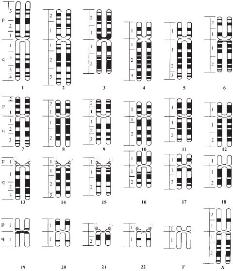Напомним читателю, что набор хромосом во всех клетках человека (за исключением половых) называют диплоидным (двойным), поскольку каждая из хромосом представлена двумя копиями (всего 23 пары). Каждая соматическая клетка человека (кроме красных кровяных клеток крови) содержит по 2 полных набора хромосом. В каждом единичном (гаплоидном) наборе присутствует 23 хромосомы — 22 обычные хромосомы (аутосомы) и по одной половой хромосоме — X или Y. Таким образом, геном каждого конкретного человека состоит из 23 пар гигантских молекул ДНК, распределенных в разных хромосомах, а если говорить о геноме человека вообще (мужчин и женщин), то общее число таких молекул равно 24. Это первое базовое сведение, которое было получено о геноме человека при анализе хромосом.