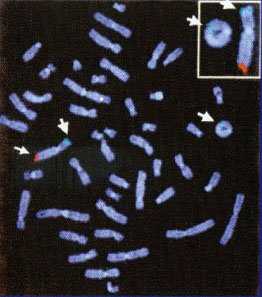 Рис. 10. Гибридизация хромосом человека с генами-зондами, мечеными красным и зеленым флюоресцентными красителями. Стрелками указано расположение соответствующих генов на концах двух разных хромосом (справа вверху дано увеличение картины гибридизующихся хромосом).
