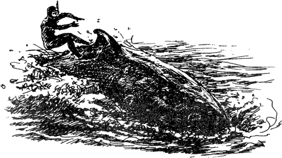 С этого дня на «Поларисе» началось соревнование: кто первым удержится на спине брыкающегося скакуна, то бишь кита? Следом за Бернаром, используя его опыт, добились успеха Бонничи и Серж Фулон. Постепенно совершенствуя технику, они научились ездить верхом на ките легко и даже элегантно. У каждого из всадников своя манера, согласно его темпераменту и нраву. Делемотт — суровый, решительный, мышцы напряжены, брови нахмурены — приближается к киту так, словно задумал помериться с ним силами в вольной борьбе. Бонничи — порывистый, резкий, быстрый — несколько секунд присматривается, затем лихо вскакивает на спину кита и мчится на нем с профессиональной улыбкой циркача.