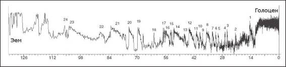Эпоха существования классических неандертальцев приходится на конец среднего и первую половину позднего плейстоцена. На протяжении этого времени имели место многократные и притом весьма значительные по амплитуде и скорости перепады температуры и влажности, объединяемые в климатические циклы продолжительностью от нескольких сотен до нескольких тысяч лет каждый. По именам впервые выделивших и описавших их исследователей — датчанина В. Дансгарда и швейцарца Г. Эшгера — они получили название циклов или событий Дансгарда-Эшгера. Для периода последнего оледенения[10], которое в Западной и Центральной Европе обычно называют вюрмским или вислинским, а в России валдайским, выделяют 24 таких цикла (рис. 19). Это оледенение длилось около 100 тысяч лет от конца эемского (микулин- ского) межледниковья (примерно 110 тыс. лет назад) и до начала современной геологической эпохи, именуемой голоценом (примерно 12 тыс. лет назад).[11]