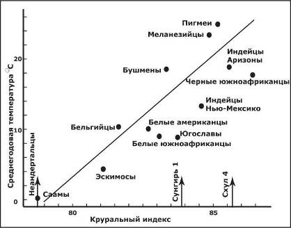 Рис. 20. Соотношение среднегодовой температуры с круральным индексом, рассчитанным для разных групп современных людей. Стрелками показано, какое место занимали бы в этой картине неандертальцы, ранние гомо сапиенс Ближнего Востока (возраст около 100 тыс. лет назад) и верхнепалеолитические гомо сапиенс Восточной Европы (возраст около 25 тыс. лет назад). По Lewin and Foley 2004: fig. 6.18, с изменениями и дополнениями.