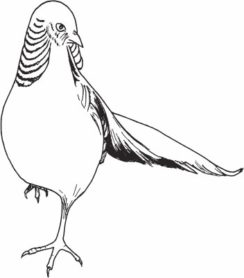 Золотой фазан (рис. 40) – это удивительно красивая птица. Голову самцов этого вида украшает золотисто-желтый длинный хохол; на шее у него – оранжево-красный «воротник», кончики перьев «воротника» – черные. Золотисто-зеленая окраска верхней части спины переходит в оранжевые тона. Нижняя часть туловища ярко-красного цвета. Яркость красок туловища оттеняет черный хвост. Клюв и ноги самца желтые. Скромная самка золотого фазана довольствуется оперением бурых цветов с поперечными полосками и пятнами.