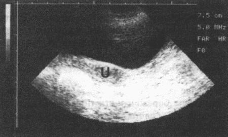 Ультразвуковое изображение матки (U), расположенной дорсально от анэхогенного мочевого пузыря. Сука исследована в стоячем положении, датчик устанавливали на вентральную брюшную стенку. Датчик на 5 МГц, шкала в см