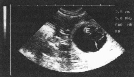 Ультразвуковое изображение единственного плодного яйца, видны эмбрион (Е), плодные оболочки (стрелка) и окружающая их анэхогенная жидкость в аллантоисе. Датчик на 5МГц, шкала в см