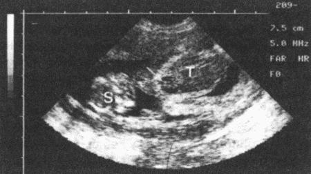 Ультразвуковое изображение плода, видны череп (S) и туловище (Т). Ясно визуализируется сердце (указано стрелкой). Датчика 5МГц, шкала в см