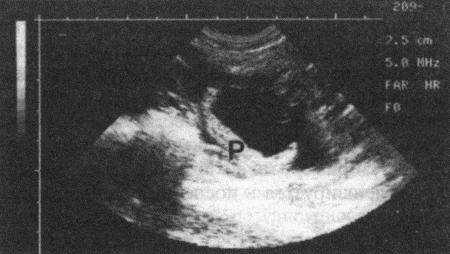 Ультразвуковое изображение плодного яйца в продольном сечении, видна С-образная зонарная плацента (Р). Датчик на 5 МГц, шкала в см